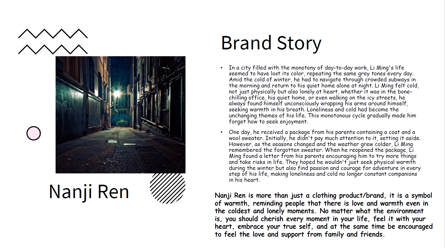 In the new design brand story, I emphasized the unique cultural heritage of Nanjiren, conveyed emotions through stories, and narrowed the distance with consumers. For example, in the brand story, through Li Ming's experience, it shows how the brand can bring warmth and encouragement to consumers in the cold and loneliness.
