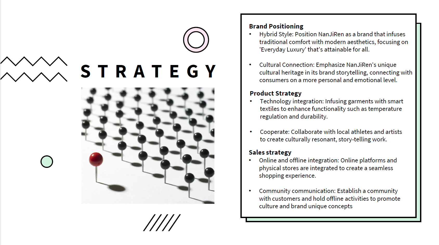 Through the integrated online and offline sales model, we create a seamless shopping experience, strengthen communication with customers through community activities, and promote the unique concept of the brand. As well as, Introduce smart textile technology to enhance product functionality, such as temperature regulation and durability. We will also collaborate with local athletes and artists to launch limited-edition products with cultural resonance.